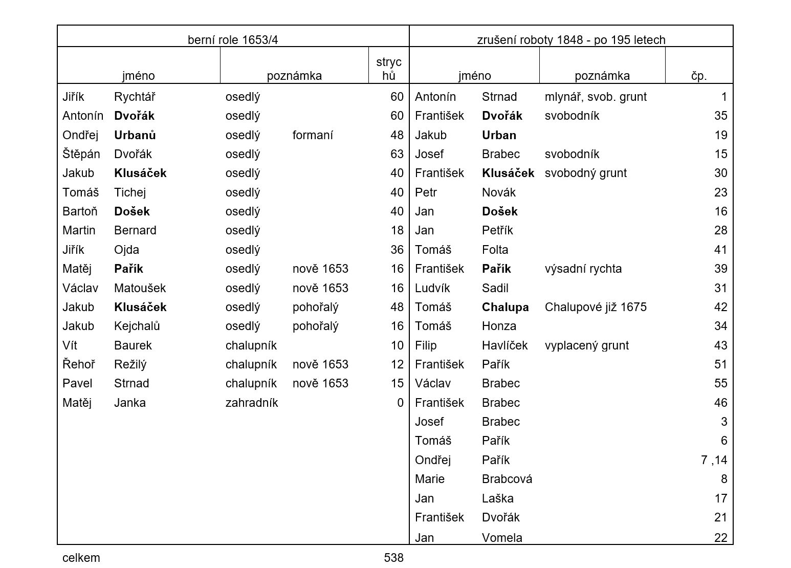 Jak vypadala situace v Hrbově v roce 1653 a po 195 letech v roce 1848 z hlediska držitelů usedlostí dokládá tabulka: